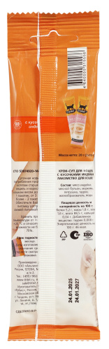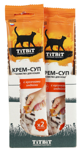 Крем-суп для кошек TITBIT – это специально разработанные вкусные и полезные продукты, которые: 1. Содержат кусочки свежего мяса; 2. Содержат 98% мясных ингредиентов; 3. Содержат дополнительные полезные ингредиенты (таурин для поддержки зрения, сердца, пищеварительной, половой и иммунной систем; морковь для поддержки зрения и пищеварения; петрушка для поддержки мочеполовой, сердечно-сосудистой и пищеварительной систем).