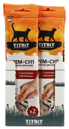 Крем-суп для кошек TITBIT – это специально разработанные вкусные и полезные продукты, которые: 1. Содержат кусочки свежего мяса; 2. Содержат 98% мясных ингредиентов; 3. Содержат дополнительные полезные ингредиенты (таурин для поддержки зрения, сердца, пищеварительной, половой и иммунной систем; морковь для поддержки зрения и пищеварения; петрушка для поддержки мочеполовой, сердечно-сосудистой и пищеварительной систем).