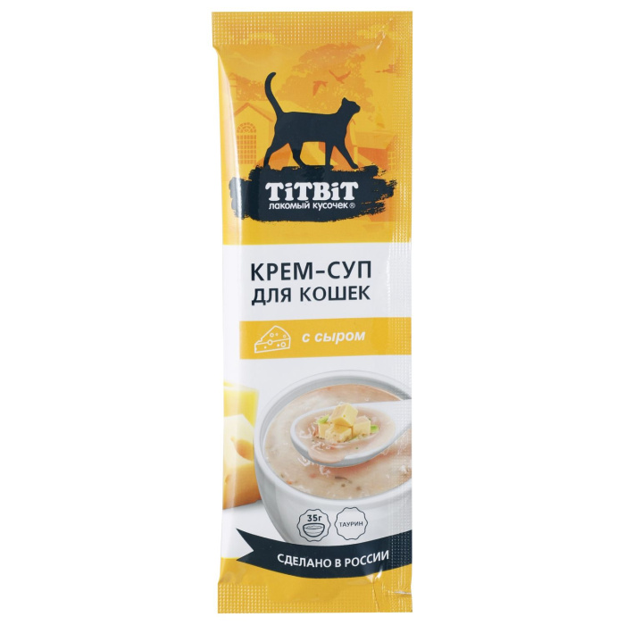 Крем-суп для кошек TITBIT – это специально разработанные вкусные и полезные продукты, которые состоят на 98 % из мясных ингредиентов, содержат кусочки свежего мяса и дополнительные полезные ингредиенты (таурин, морковь и петрушка для поддержки зрения, сердца, пищеварительной, половой и иммунной систем).