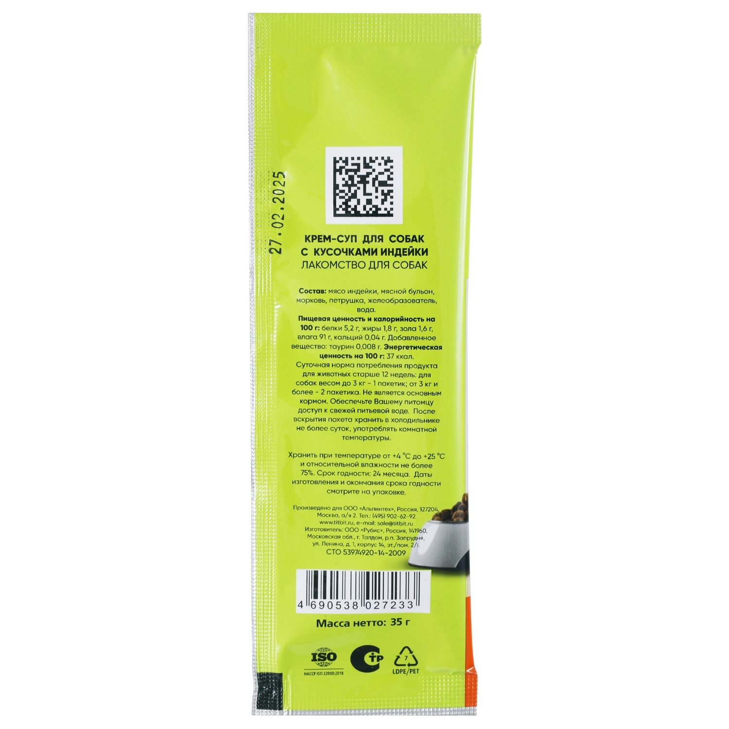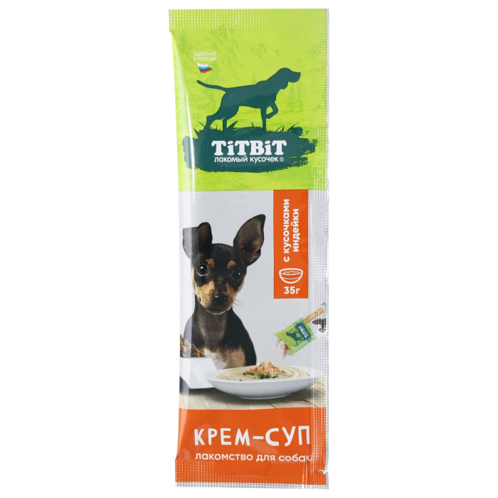 Крем-суп TITBIT – это влажное лакомство, нежной кремовой текстуры с кусочками мяса. Изготовлен из натуральных ингредиентов, содержит 98% мяса. Порция рассчитана на один прием пищи, идеально дополнит и разнообразит рацион вашего питомца. Удобная упаковка позволяет кормить питомца прямо с рук или брать с собой в дорогу. Подходит собакам любых пород и размеров, старше 12 недель.