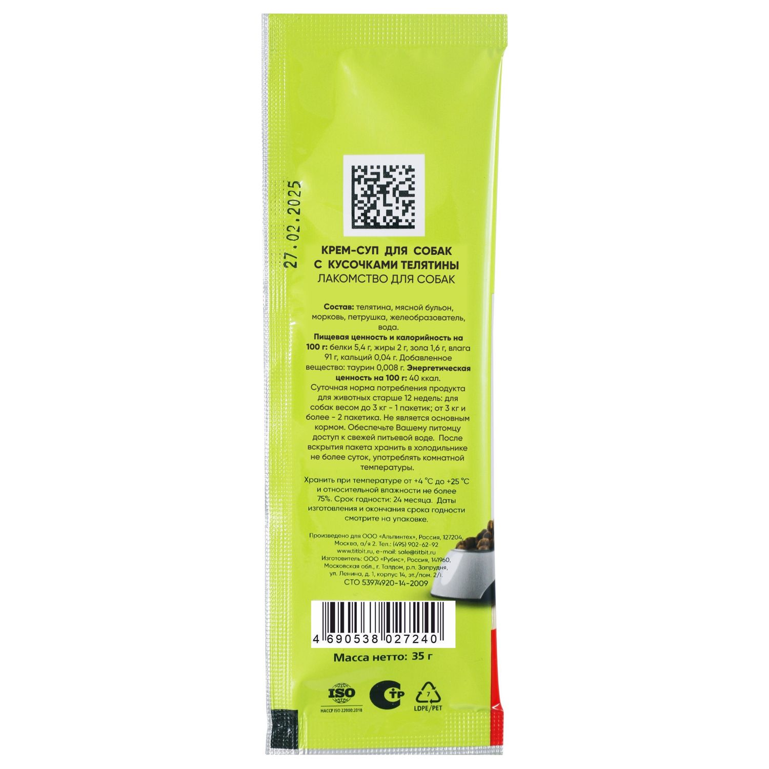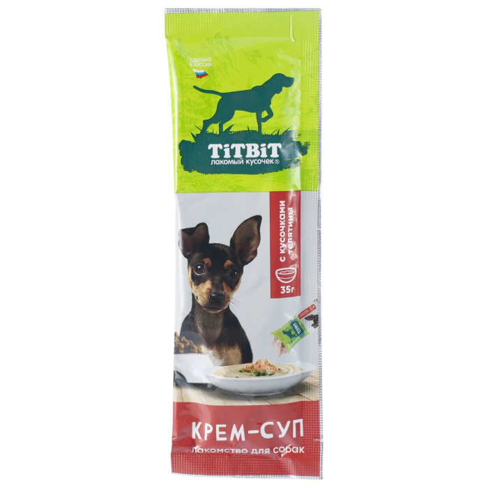 Крем-суп TITBIT – это влажное лакомство, нежной кремовой текстуры с кусочками мяса. Изготовлен из натуральных ингредиентов, содержит 98% мяса. Порция рассчитана на один прием пищи, идеально дополнит и разнообразит рацион вашего питомца. Удобная упаковка позволяет кормить питомца прямо с рук или брать с собой в дорогу. Подходит собакам любых пород и размеров, старше 12 недель.