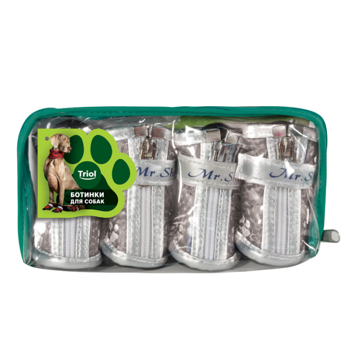 Комплект ботинок для собак с модным принтом и функциональной прорезиненной подошвой - незаменимый аксессуар индивидуальной защиты лап животного от воздействия агрессивных жидкостей, дорожных химреагентов, бензинов и масел на проезжей части дорог. Прочные, комфортные и непромокаемые, они сохраняют лапы собаки чистыми и сухими в ненастную погоду и защищают их от истирания о твердое покрытие при длительных и интенсивных нагрузках. Размер изделия: 45х40х50 мм. Цвет: серебряный.