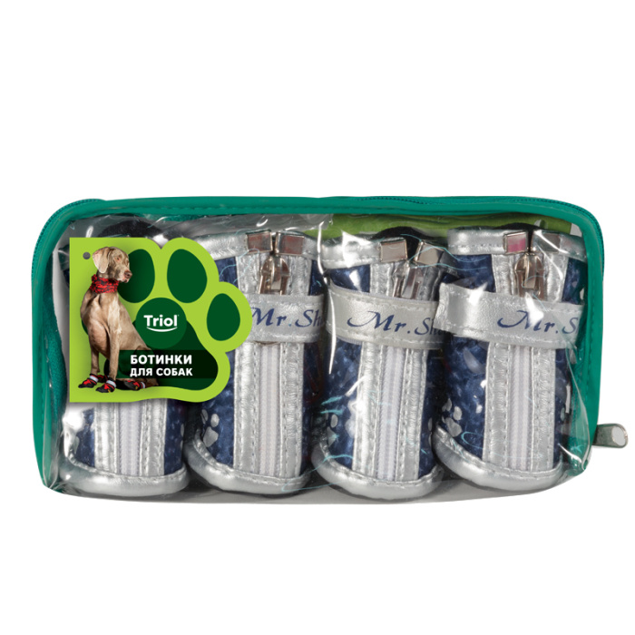 Комплект ботинок для собак с модным принтом и функциональной прорезиненной подошвой - незаменимый аксессуар индивидуальной защиты лап животного от воздействия агрессивных жидкостей, дорожных химреагентов, бензинов и масел на проезжей части дорог. Прочные, комфортные и непромокаемые, они сохраняют лапы собаки чистыми и сухими в ненастную погоду и защищают их от истирания о твердое покрытие при длительных и интенсивных нагрузках. Размер изделия: 40х30х40 мм. Цвет: синий.