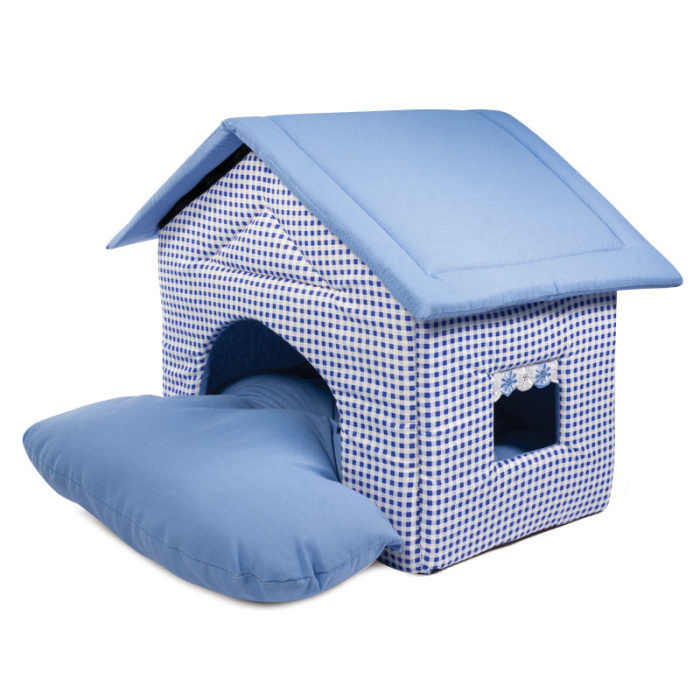Оригинальный домик для кошек и собак мелких пород - лучшее решение для комфортного времяпрепровождения. Мягкий и приятный на ощупь, домик на поролоновой основе отделан качественной бязью клетчатой расцветки. Сбоку изделия - сквозное окошко с имитацией короткой шторки, а перед входом - мягкая подушка, которая "уходит" внутрь изделия, обеспечивая питомцу комфортное уединение. Домик легко стирается в обычной стиральной машине, его удобно брать с собой на дачу или в длительную поездку - он не занимает много места и легко складывается, благодаря мягкому каркасу и крыше на молнии. Размер изделия: 460*500*450ммм. Цвет: голубой.