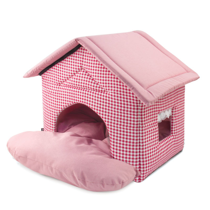 Оригинальный домик для кошек и собак мелких пород - лучшее решение для комфортного времяпрепровождения. Мягкий и приятный на ощупь, домик на поролоновой основе отделан качественной бязью клетчатой расцветки. Сбоку изделия - сквозное окошко с имитацией короткой шторки, а перед входом - мягкая подушка, которая "уходит" внутрь изделия, обеспечивая питомцу комфортное уединение. Домик легко стирается в обычной стиральной машине, его удобно брать с собой на дачу или в длительную поездку - он не занимает много места и легко складывается, благодаря мягкому каркасу и крыше на молнии. Размер изделия: 460*500*450ммм. Цвет: розовый.