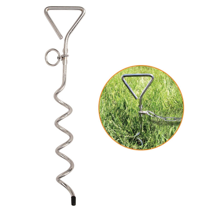 Фиксатор выполнен в виде штопора, который легко вкручивается в землю, обеспечивая надежное закрепление тросового поводка или цепи на территории. Держатель выполнен из высокопрочной стали и оснащен кольцом для крепления цепи. Размеры изделия: 415*90 мм.