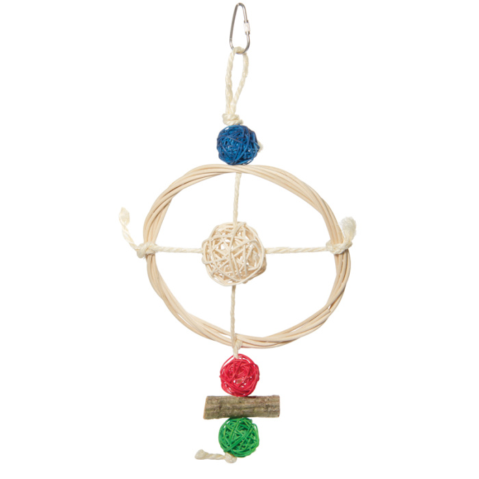 Игрушка для птиц в виде большого плетеного кольца, трех шариков и деревянного бруска. Крепление: карабин. Размер: 320/350*140мм.