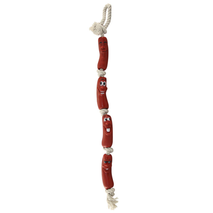 Предназначена для тяговых игр с собаками. Хорошо развивает челюсть собаки. Цвет веревки: белый, цвет "сосисок": коричневый. Размер 630*40*25мм.