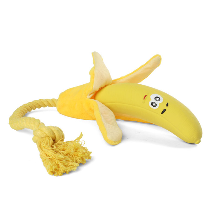 "Банан с веревкой" - это сочетание нескольких материалов в одной игрушке. "Банан" из латекса с пищалкой внутри, шуршащие "листья" и веревка для перетяжки - такая комбинация не оставит равнодушной ни одну собаку! Цвет изделия: желтый. Размер изделия: "банан" - 155*40*35мм, "листья" - 165мм, общая длина игрушки - 435мм.