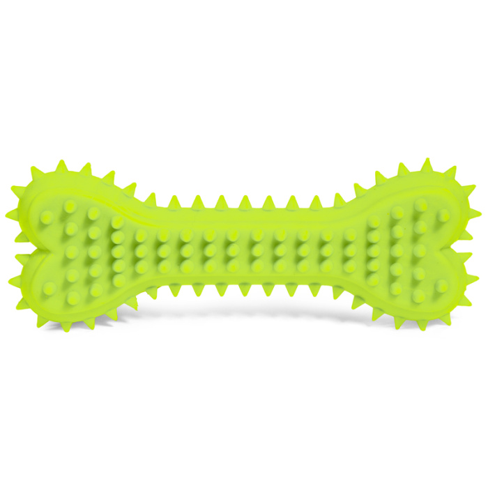 Полноценная жизнь собак – это не только сбалансированное питание и ежедневные прогулки, но и игры. Резиновые игрушки помогают снять стресс, если хозяина нет дома, а также способствуют формированию правильного поведения. Игрушки из резины достаточно прочные, они особенно незаменимы для собак с сильной жевательной потребностью. "Шипы" на поверхности игрушки способствуют чистке зубов и устранению зубного налета. Цвет изделия: розовый, синий, зеленый. Размер изделия: 150*55*25мм.