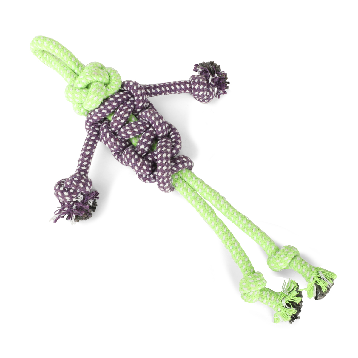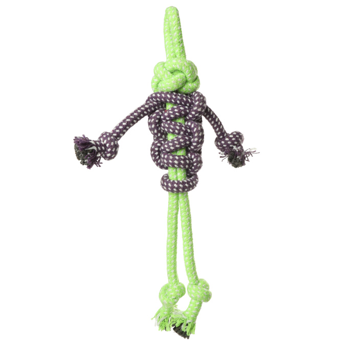 Веревочная игрушка в виде человечка предназначена для тяговых игр с собаками. Такие игрушки хорошо развивают челюсть, массируют десны и способствуют очищению зубного налета. Веревка сплетена из нитей натурального хлопка, поэтому безопасна для здоровья Вашего питомца. Цвет изделия: зеленый с фиолетовым. Размер изделия: 270*50*40мм.