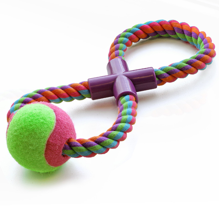 Веревка-восьмерка цветная с мячом 180-190г. Собаки обожают играть с веревочными игрушками, так как их можно грызть, трепать и носить в зубах. Такие игрушки отлично массируют десны и очищают зубной налет во время игры. Веревочные игрушки сплетены из нитей