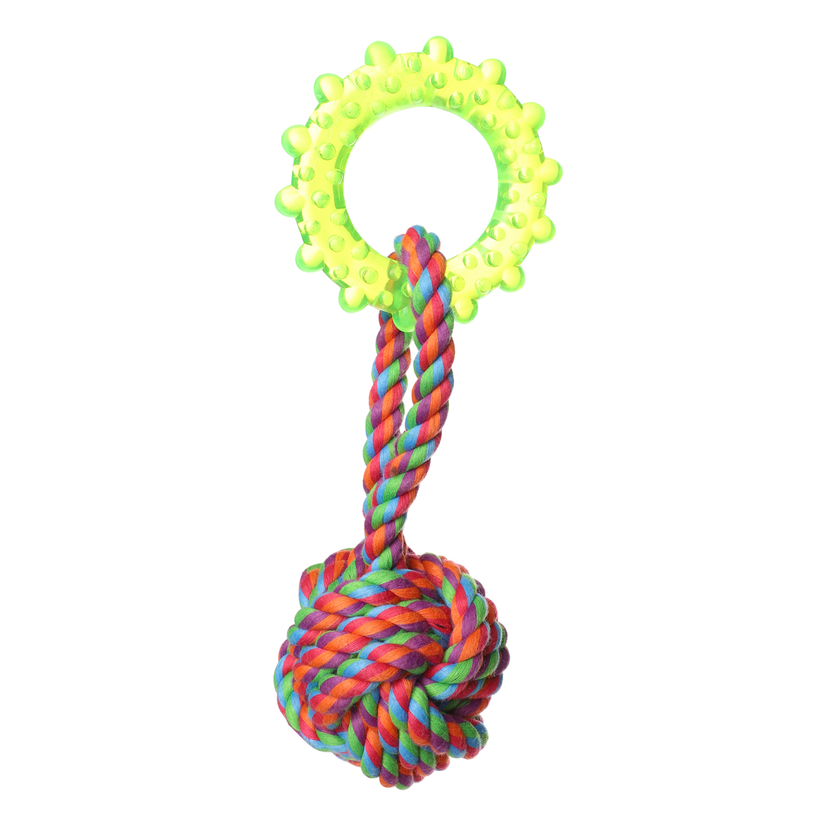 Игрушка с веревочным мячом и кольцом из термопластичной резины подойдёт для тяговых игр с собаками. Собаки обожают играть с веревочными игрушками, так как их можно грызть, трепать и носить в зубах. Такие игрушки отлично массируют десны и очищают зубной налет во время игры. Веревка сплетена из хлопковых нитей и безопасна для здоровья питомца. Цвет изделия: разноцветный. Вес изделия: 125г. Размер изделия: 200*80*70мм (кольцо - 80мм, мяч - 70мм).