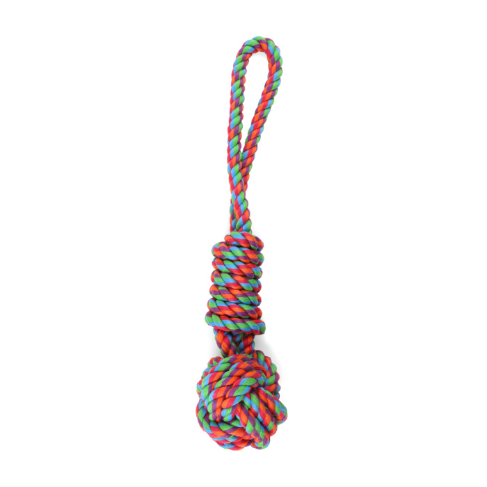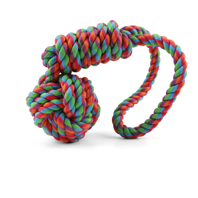 Веревка с плетёным мячом предназначена для тяговых игр с собаками. Собаки обожают играть с веревочными игрушками, так как их можно грызть, трепать и носить в зубах. Такие игрушки отлично массируют десны и очищают зубной налет во время игры. Веревка сплетена из хлопковых нитей и безопасна для здоровья питомца. Цвет изделия: разноцветный. Вес изделия: 160г. Размер изделия: 320*70*70мм (мяч - 70мм).