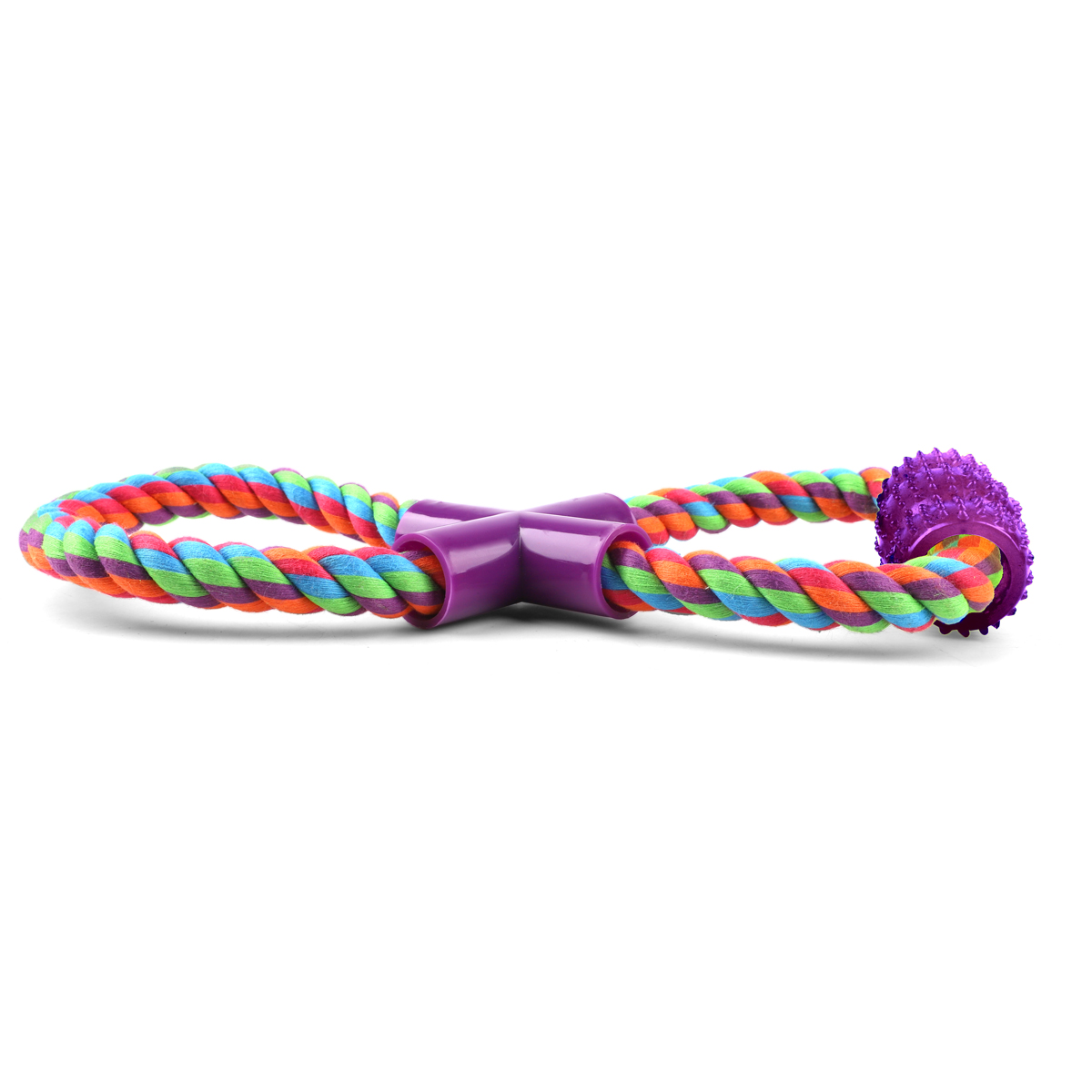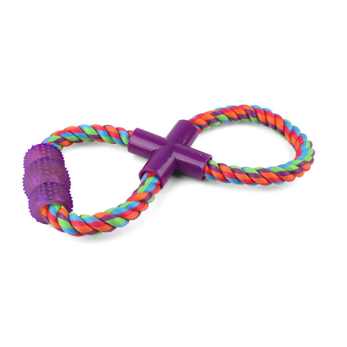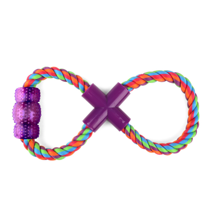 Веревка-восьмёрка с ручкой предназначена для тяговых игр с собаками. Собаки обожают играть с веревочными игрушками, так как их можно грызть, трепать и носить в зубах. Такие игрушки отлично массируют десны и очищают зубной налет во время игры. Веревка сплетена из хлопковых нитей и безопасна для здоровья питомца. Цвет изделия: разноцветный. Вес изделия: 150г. Размер изделия: 270*110*35мм.