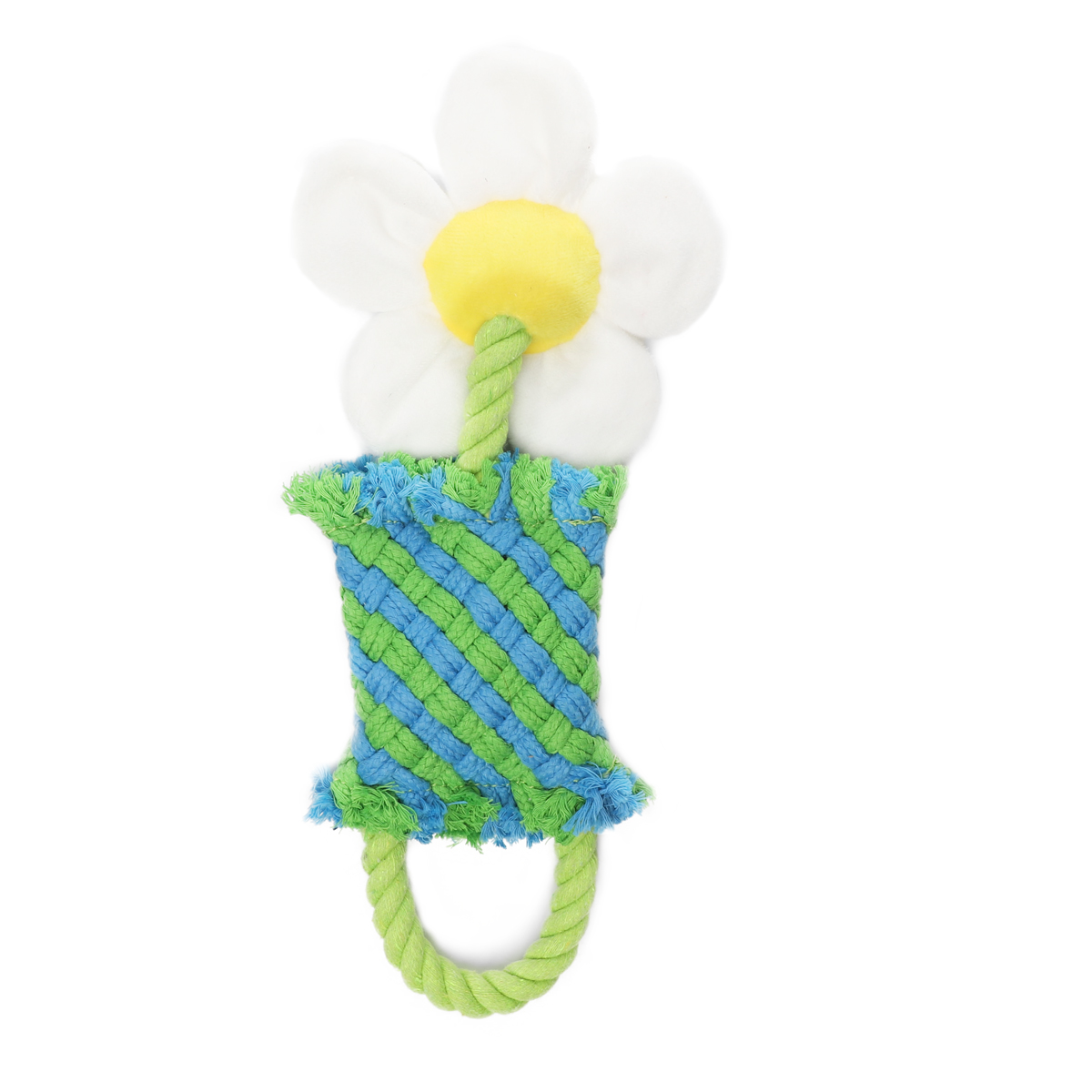 Забавная и функциональная игрушка в виде ромашки, выполненная из плетёных верёвок - это экологичное, прочное и безопасное развлечение для вашего питомца. Она отлично подходит для активных игр, массажа дёсен и чистки зубов. Шуршащие элементы в лепестках заинтересуют собаку любого возраста. Внутри игрушки находится звонкая "пищалка", которая пробуждает охотничьи инстинкты животного, делая игру еще интереснее. Цвет: бело-зеленый. Размер: 270*120*30мм.