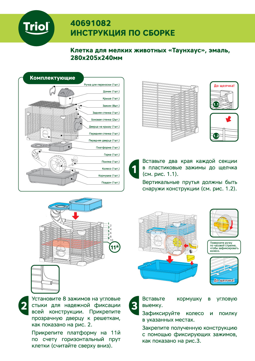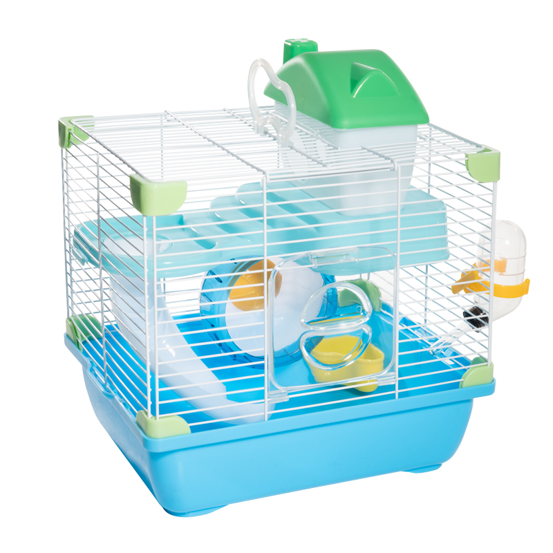 Уютная клетка прямоугольной формы с горизонтальными прутьями - удобный и функциональный двухэтажный дом для грызунов: он занимает совсем немного места и отлично подходит для содержания мышей и хомяков. В комплектацию изделия входят: домик, пластиковая миска, поилка с носиком, беговое колесо и горка. Кроме того, клетка оборудована удобной ручкой на крыше, облегчающей процесс транспортировки. Клетка в красивой упаковке - отличный подарок любителям грызунов. Цвет решетки: белый. Цвет поддона: голубой. Размер между прутьями: 9мм. Размер изделия: 280*205*240мм (высота без учета домика).