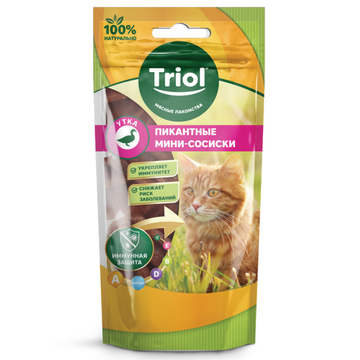 Пикантные мини-сосиски из утки – это полезное угощение для здоровья вашего питомца, обогащенное общеукрепляющим комплексом витаминов А, Е и D3. Вес нетто 50г.