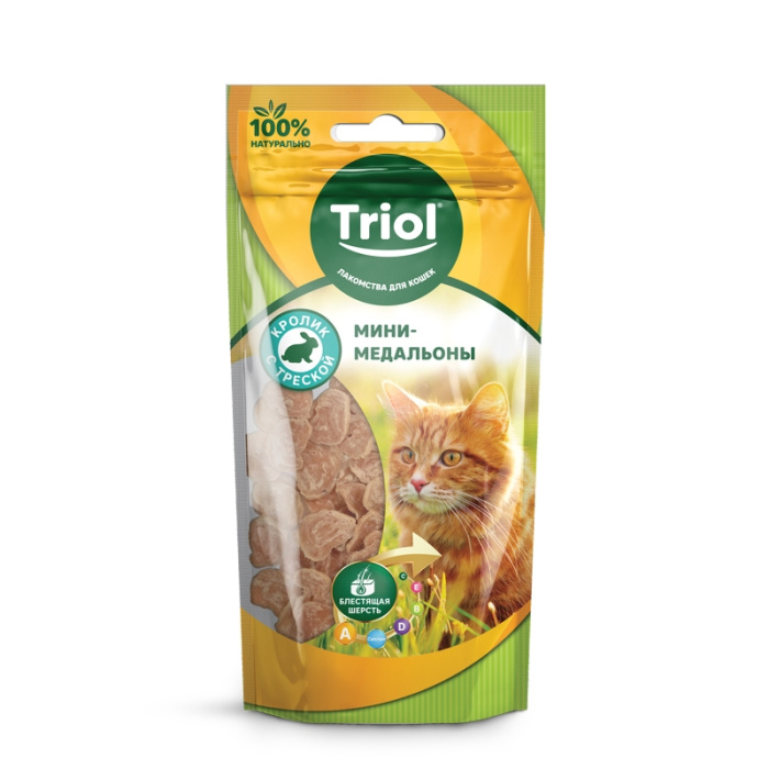 Мини-медальоны из кролика с треской – это полезное угощение для здоровья, красоты и блеска шерстного покрова вашего питомца, обогащенное Омега-3 кислотами. Вес нетто 40г.