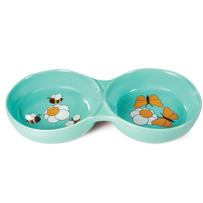 Стильная и функциональная миска для кошек и собак мелких пород выполнена из высококачественной керамики оригинальной расцветки. Такая миска - идеальный способ обеспечить питомцу одновременно и свежую воду, и корм. Изделие комфортно для питомца и легко моется под струей проточной воды с использованием моющих бытовых средств. Цвет: мятный. Размер: d дна половинки - 80мм; d верхней части - 110мм; высота - 30мм. Объем: 2*0,2л.