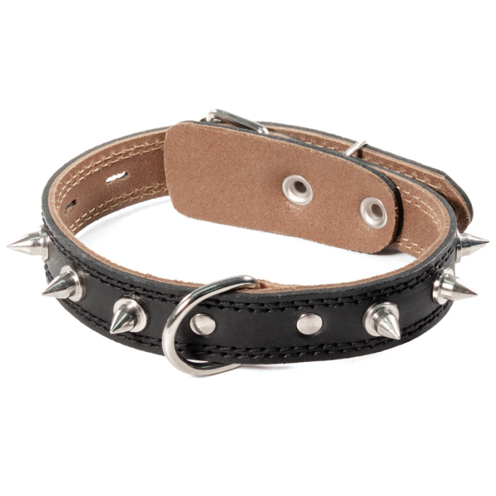 Стильный кожанный ошейник с крупными металлическими шипами подойдет для собак средних пород весом 13-20 кг., обхват шеи 45-50см. Варианты пород: стаффордширский бультерьер, французский бульдог,английский бульдог,скотч- терьер , доберман, долматинец, ягт-терьер, бигль, лайка и т.д. Изделие выполнено из прочной двухслойной кожи с использованием крепкой металлической фурнитуры. Предусмотренные отверстия позволяют удобно подгонять длину под индивидуальные параметры животного. Размеры изделия: 570*250*3мм. Цвет: черный.