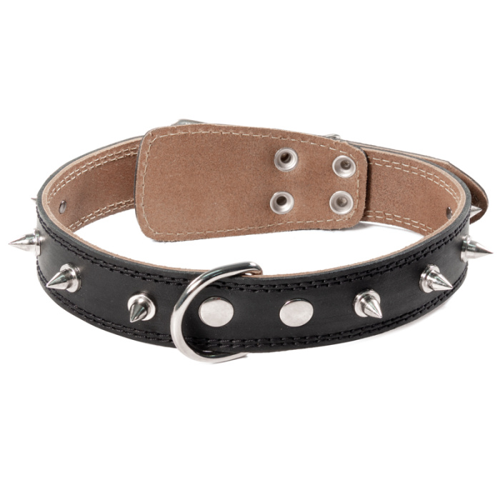 Стильный кожанный ошейник с крупными металлическими шипами подойдет для собак крупных пород весом 20-35кг., обхват шеи 55-60см. Варианты пород: английский бульдог (кобель), американский бульдог, стаффордширский бультерьер, питбуль, доберман, ротвейлер, аргентинский дог, родезийский риджбек. Изделие выполнено из прочной двухслойной кожи с использованием крепкой металлической фурнитуры. Предусмотренные отверстия позволяют удобно подгонять длину под индивидуальные параметры животного. Предусмотренные отверстия позволяют удобно подгонять длину под индивидуальные параметры животного. Размеры изделия: 630мм*350мм*3мм. Цвет: черный.