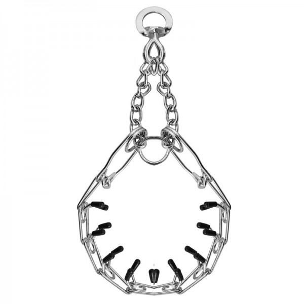 Строгий ошейник-удавка с защитными пластиковыми насадками на шипах - функциональный аксессуар для собак средних и крупных пород и эффективная мера воздействия при длительных прогулках и интенсивной дрессировке. Расположенные внутри ошейника шипы позволяют координировать все действия собаки и держать ее под строгим контролем. При этом пластиковые насадки на шипах защищают кожу питомца от царапин и повреждений. Диаметр проволоки - 3мм, длина ошейника - 500мм. Цвет: хром.