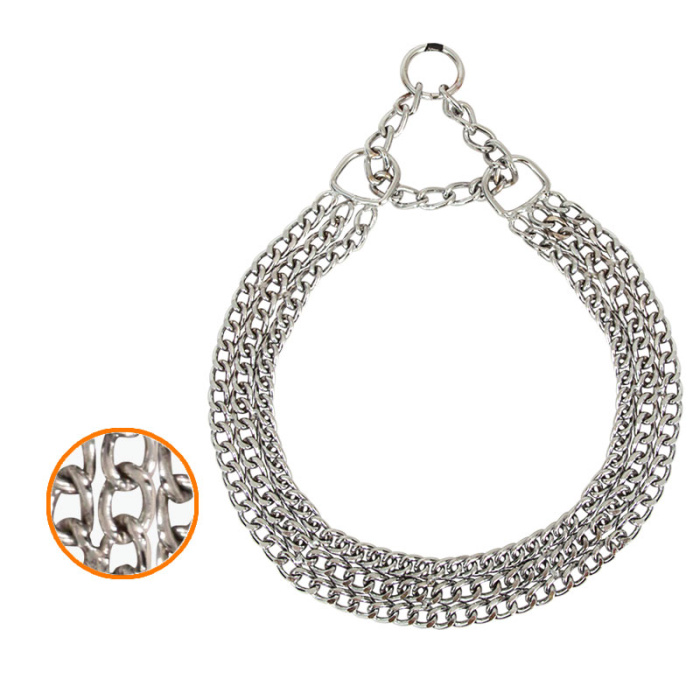 Функциональный трехрядный ошейник-удавка из металла - это незаменимый аксессуар для выгула и дрессировки бойцовских собак и питомцев крупных пород. Ошейник моментально затягивается при натяжении поводка, за счет чего эффективен при дрессировке с целью усиления воздействия на рывках. Аксессуар не перетирает шерсть, так как изготовлен из металла высокого качества, защищен от коррозии, не боится влаги и дождя и легко моется от грязи и пыли. Диаметр проволоки - 2,5мм, длина ошейника - 600мм.