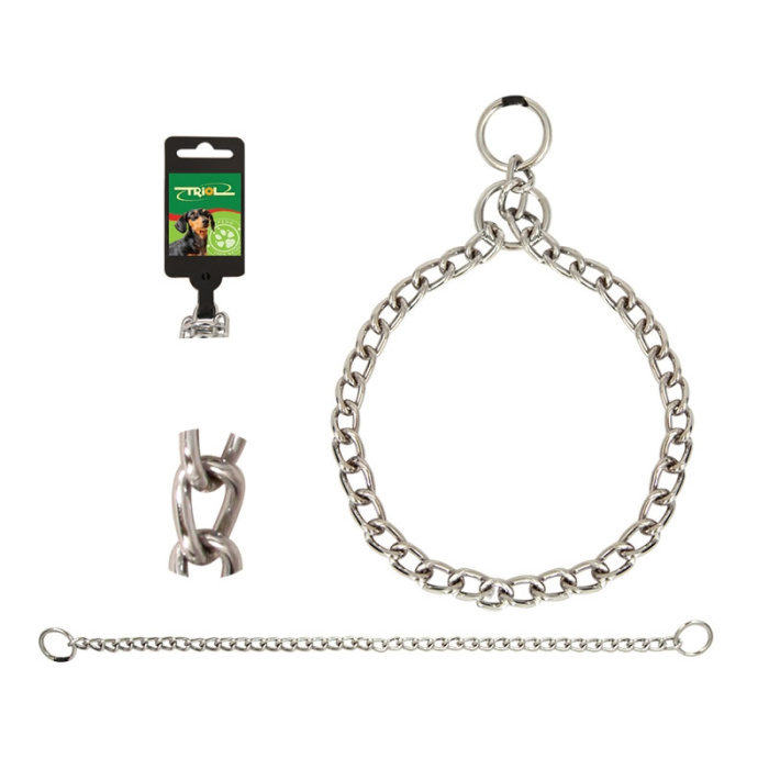 Ошейник-удавка однорядный из металлических звеньев создан для безопасного выгула активных и сильных собак. Звенья имеют гладкую поверхность и плотно скреплены между собой, благодаря чему шерсть собаки не травмируется даже при сильном натяжении. Ошейник имеет специальные кольца для удобной фиксации поводка. Диаметр проволоки - 4мм, длина - 750мм.