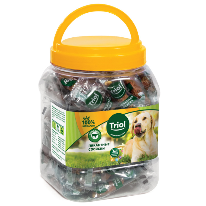 Пикантные сосиски из говядины – это незаменимое лакомство для активного отдыха с вашим любимцем, которое подарит заряд бодрости и энергии благодаря повышенному содержанию витаминов B1, B6, B12 и L-карнитина. Сосиски расфасованы в пластиковые банки, при этом каждая сосиска упакована в индивидуальный пакетик со штрихкодом и всей необходимой информацией о продукте. Таким образом, потребитель может выбрать: покупать целую банку или поштучно. Банку с эргономичной ручкой удобно хранить и легко транспортировать. Вес нетто 500г. В банке 65-72 сосиски.