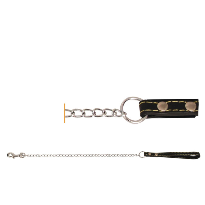 Особопрочный поводок-цепь для сильных и очень активных собак. Звенья и кольца сварные, с качественным стойким хромированием, стальной карабин. Цепь имеет ровный строй, не перекручивается. Отлично подойдет для повседневного выгула, а также для дрессировки собаки. Кожаная ручка сделает использование максимально удобным для хозяина. Диаметр проволоки - 2мм, длина - 1100мм.