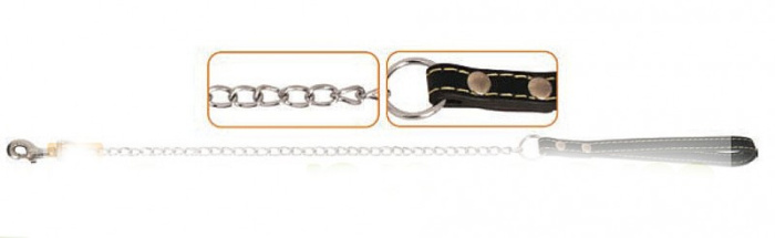 Особопрочный поводок-цепь для сильных и очень активных собак. Звенья и кольца сварные, с качественным стойким хромированием, стальной карабин. Цепь имеет ровный строй, не перекручивается. Отлично подойдет для повседневного выгула, а также для дрессировки собаки. Кожаная ручка сделает использование максимально удобным для хозяина. Диаметр проволоки - 3мм, длина - 1100мм.