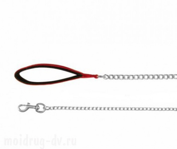 Особопрочный поводок-цепь для сильных и очень активных собак. Звенья и кольца сварные, с качественным стойким хромированием, стальной карабин. Цепь имеет ровный строй, не перекручивается. Отлично подойдет для повседневного выгула, а также для дрессировки собаки. Кожаная ручка сделает использование максимально удобным для хозяина. Диаметр проволоки - 4мм, длина - 1100мм.