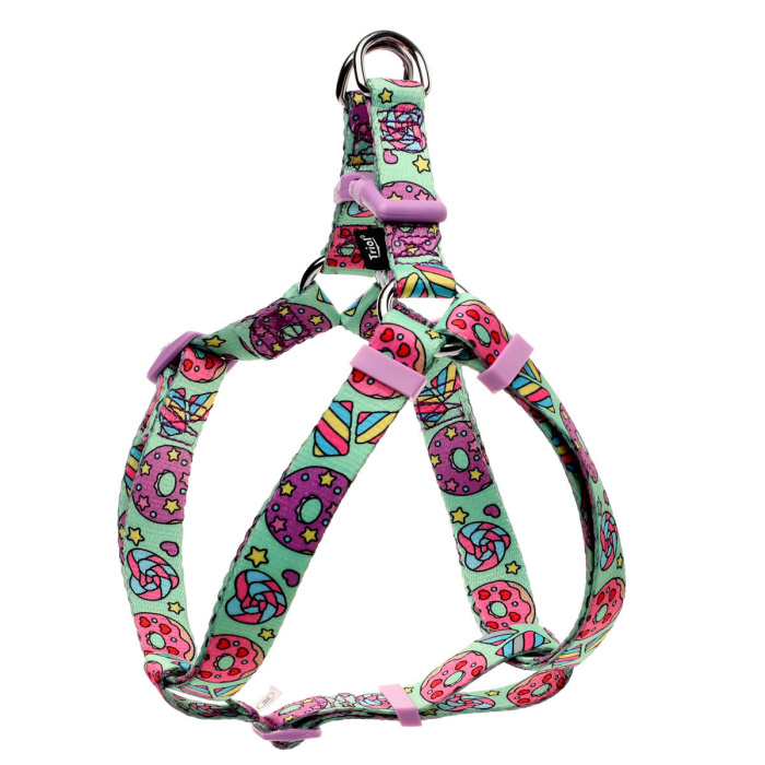 Универсальная шлейка "Пончики" изготовлена из высококачественного нейлона с использованием крепкой металлической и пластиковой фурнитуры. Шлейка двусторонняя, поэтому можно надевать ее то одной, то другой стороной вверх, меняя рисунок. Регулируемая шлейка Y-образной формы с надежной пряжкой обеспечивает комфортную фиксацию изделия на теле животного без причинения дискомфорта даже при постоянной носке. Цвет: бирюзово - фиолетово - розовый.