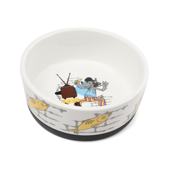 Стильная и функциональная миска для собак и кошек выполнена из высококачественной керамики оригинальной расцветки. Благодаря резиновому кольцу в основании миски изделие не гремит и очень устойчиво на любой поверхности. Такая миска идеально подойдет как для воды, так и для корма любой консистенции. Она комфортна для питомца и легко моется под струей проточной воды с использованием бытовых моющих средств. А эффектный дизайн с персонажем известного советского мультфильма позволит ей стать украшением любого интерьера. Цвет изделия: белый с принтом. Размер изделия: d дна - 125мм; d верхней части - 140мм; высота - 55мм. Объем - 0,45л.