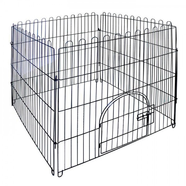 Клетка для животных эмалированная. Размер между прутьями 34,9мм. В комплекте 4 панели, одна из них с металлической дверцей, с надежным защищенным запором-задвижкой, которая открывается на 180 градусов, плотно прижимаясь к стенке. Конструкция получается на