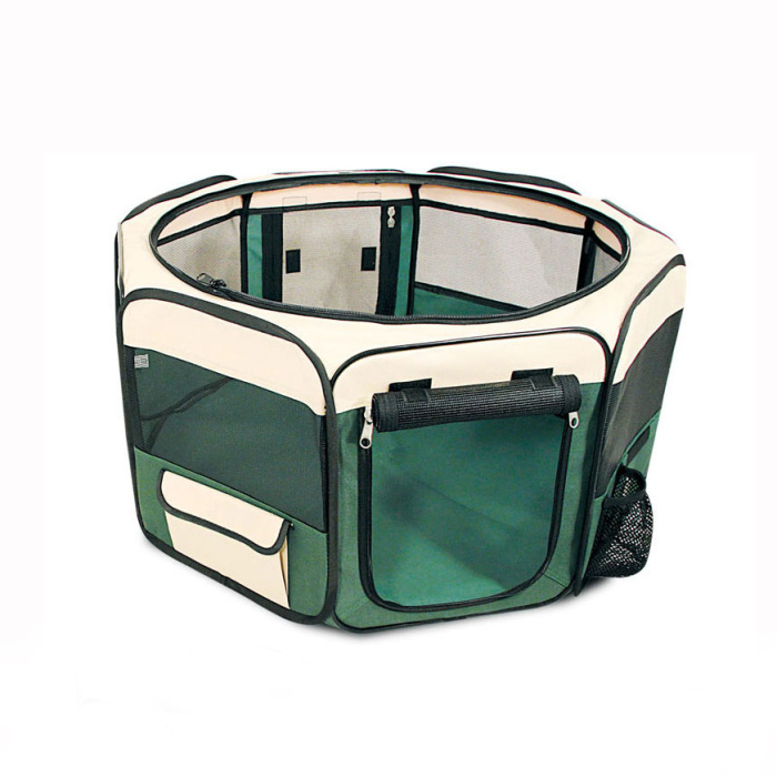 Удобный складной матерчатый вольер-тент - универсальное решение для владельцев собак. Его можно использовать как на улице, так и в помещении в качестве основного места для собаки. Незаменимым атрибутом дом-тент является для владельцев собак на выставках и при перевозке во время длительных путешествий. Дополнительная сетка (идет в комплекте) не дает возможности животному выбраться, а вшитая металлическая конструкция в разложенном виде крепко натягивает ткань, обеспечивая изделию максимальную устойчивость. Изделие имеет удобное отделение для поилки, съемная сетчатая крыша позволяет питомцу свободно дышать, а непромокаемое дно надежно фиксируется при помощи липучек и легко стирается в стиральной машине. Цвет: бежево-зеленый. Размер: 1800х1800х770мм
