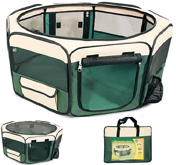 Удобный складной матерчатый вольер-тент - универсальное решение для владельцев собак. Его можно использовать как на улице, так и в помещении в качестве основного места для собаки. Незаменимым атрибутом дом-тент является для владельцев собак на выставках и при перевозке во время длительных путешествий. Дополнительная сетка (идет в комплекте) не дает возможности животному выбраться, а вшитая металлическая конструкция в разложенном виде крепко натягивает ткань, обеспечивая изделию максимальную устойчивость. Изделие имеет удобное отделение для поилки, съемная сетчатая крыша позволяет питомцу свободно дышать, а непромокаемое дно надежно фиксируется при помощи липучек и легко стирается в стиральной машине. Цвет: бежево-зеленый. Размер: 1390х1390х620мм