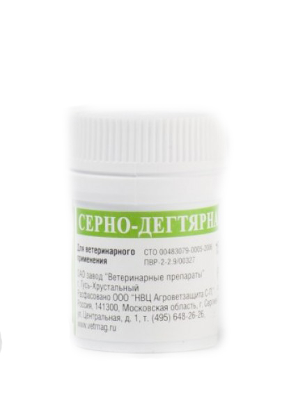 Мазь серно-дегтярная - применяется для лечения кожных заболеваний у животных (кроме кошек). Обладает противомикробным, противогрибковым и акарицидным действием. Относится к веществам малоопасным (4 класс опасности).