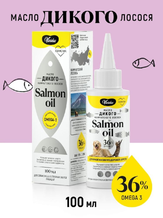 Масло VIVIDUS - единственное на российском рынке лососевое масло, источником которого является дикий лосось. Именно этим VIVIDUS отличается от многочисленных аналогов, которые производятся из фермерского лосося, выращенного на комбикормах, содержащих гормоны роста и антибиотики. Дикий лосось намного чище и экологичнее своего искусственного собрата. По содержанию полезных омега-3 кислот дикий лосось также богаче фермерской рыбы. В масле содержится около 36% омега-3, против 10-20% в продуктах из фермерского лосося. Систематический прием оказывает благоприятное действие на организм животного, улучшение качества шерсти, она становится здоровой и блестящей, сокращается период линьки, уменьшение боли в суставах при артритах и артрозах, укрепление иммунитета, улучшение аппетита.