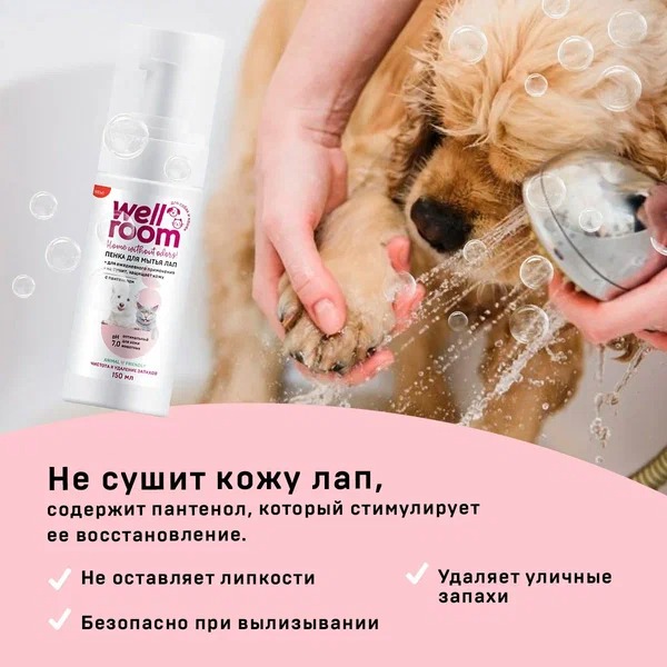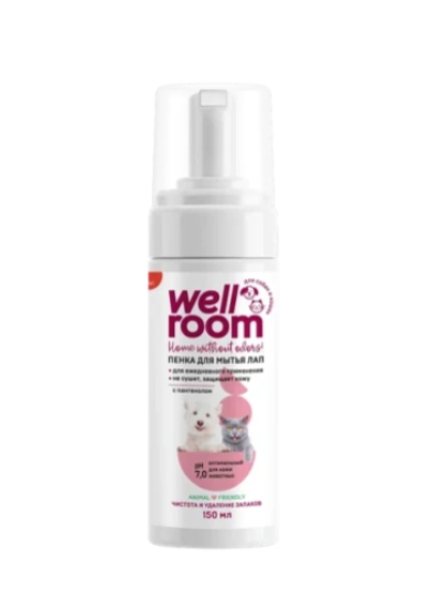 Пенка для мытья лап с пантенолом Wellroom разработана для ежедневной эффективной очистки лап питомца после прогулки.