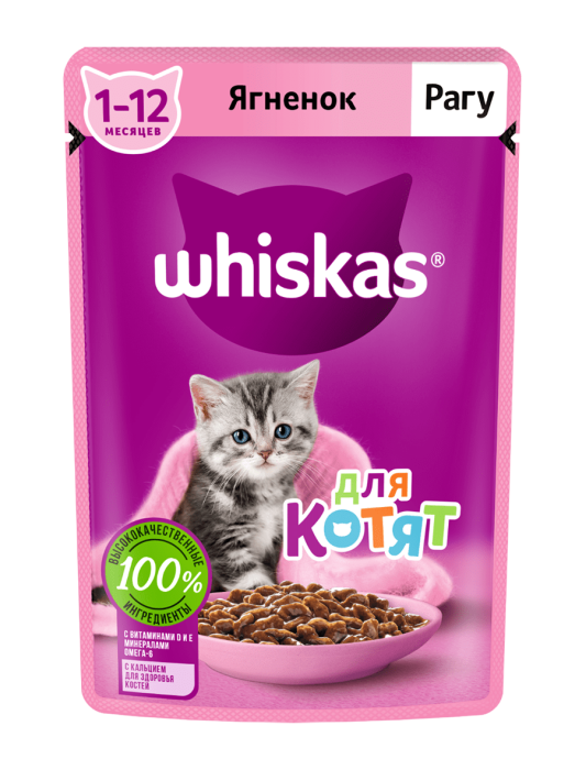 Рацион Whiskas® для котят ""Рагу с ягненком"" — это сбалансированный рацион для здорового роста вашего малыша. Котенок с удовольствием попробует маленькие нежные кусочки с ягненком в ароматном соусе. Все для замурррчательной жизни! Рационы Whiskas® для котят позаботятся об иммунитете, поддержат здоровое пищеварение и обеспечат здоровый рост и развитие. Котята активно растут и с первых дней нуждаются в правильном питании.