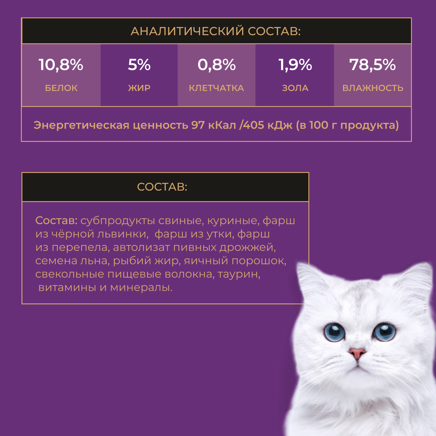 - Корм содержит содержит уникальный компонент - фарш из свежей чёрной львинки. Это источник гипоаллергенного полноценного белка, источник множества полезных аминокислот и микроэлементов, естественная и желанная пища пушистого хищника.