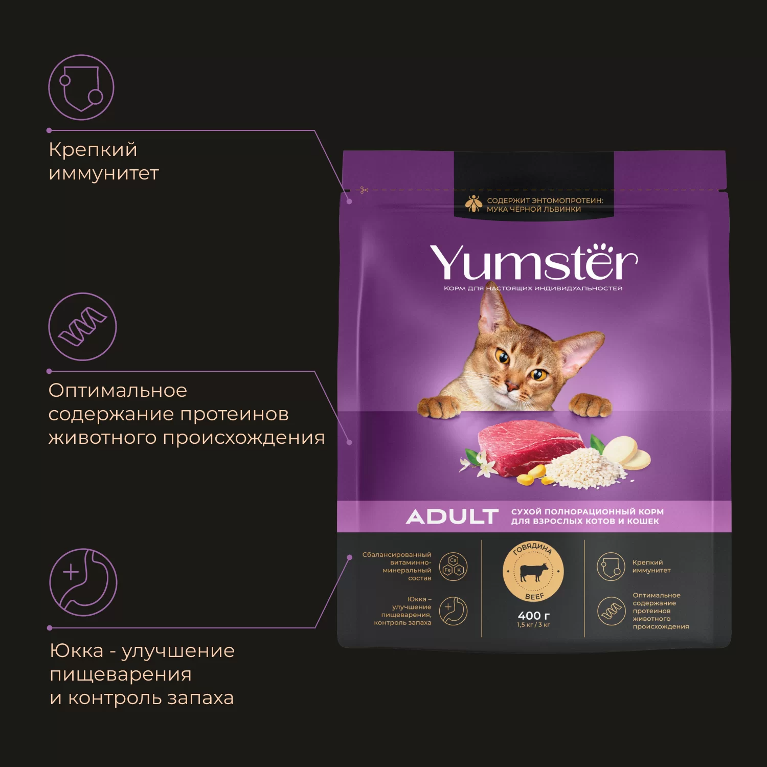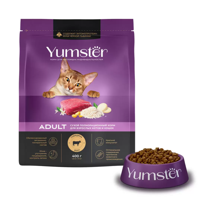 Корм Yumster для взрослых кошек с говядиной содержит полный набор веществ, необходимых пушистому хищнику с учетом его природных потребностей. Прежде всего, это мясные игредиенты, сытная говядина, а также полезные злаки и другие натуральные компоненты для здорового пищеварения. Сбалансированный витаминно-минеральный состав в сочетании с высокой вкусовой привлекательностью – для красоты, здоровья и активного долголетия Вашего питомца.