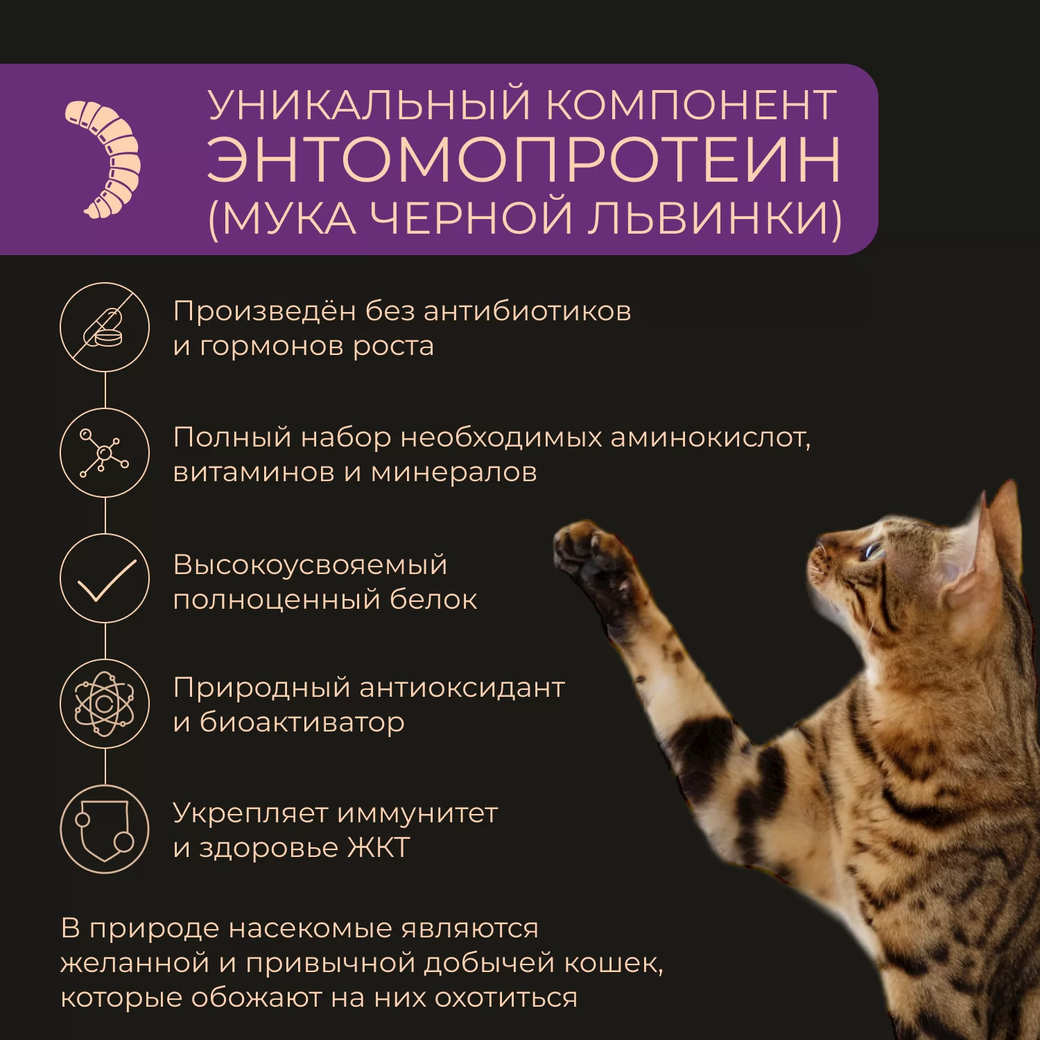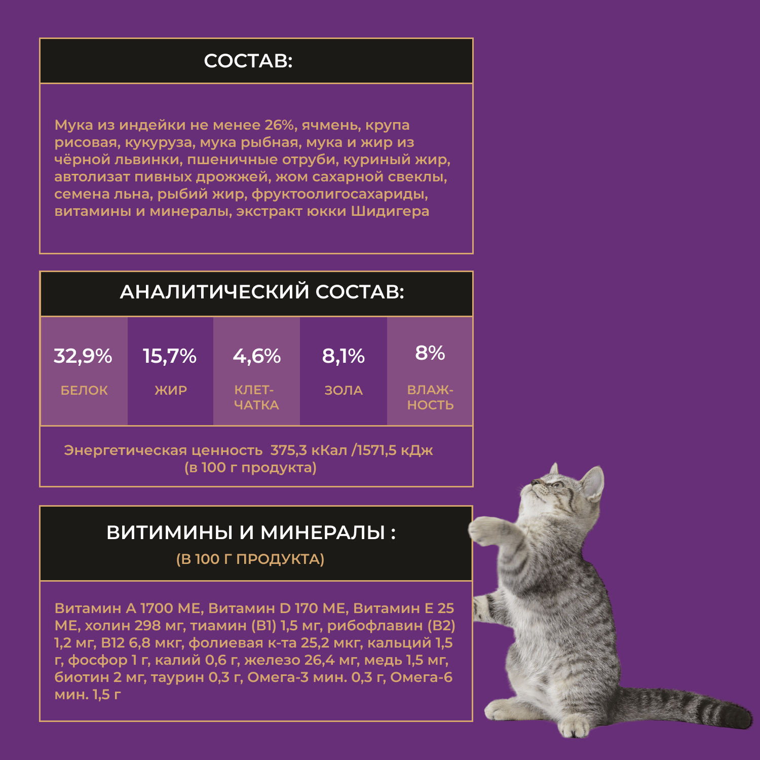 Мука из индейки не менее 26%, ячмень, крупа рисовая, кукуруза, мука рыбная, мука и жир из чёрной львинки, пшеничные отруби, куриный жир, автолизат пивных дрожжей, жом сахарной свеклы, семена льна, рыбий жир, фруктоолигосахариды, витамины и минералы, экстракт юкки Шидигера Витамины и минералы (в 100 г продукта), в том числе: Витамин А 1700 МЕ, Витамин D 170 МЕ, Витамин Е 25 МЕ, холин 298 мг, тиамин (В1) 1,5 мг, рибофлавин (В2) 1,2 мг, В12 6,8 мкг, фолиевая к-та 25,2 мкг, кальций 1,5 г, фосфор 1 г, калий 0,6 г, железо 26,4 мг, медь 1,5 мг, биотин 2 мг, таурин 0,3 г, Омега-3 мин. 0,3 г, Омега-6 мин. 1,5 г