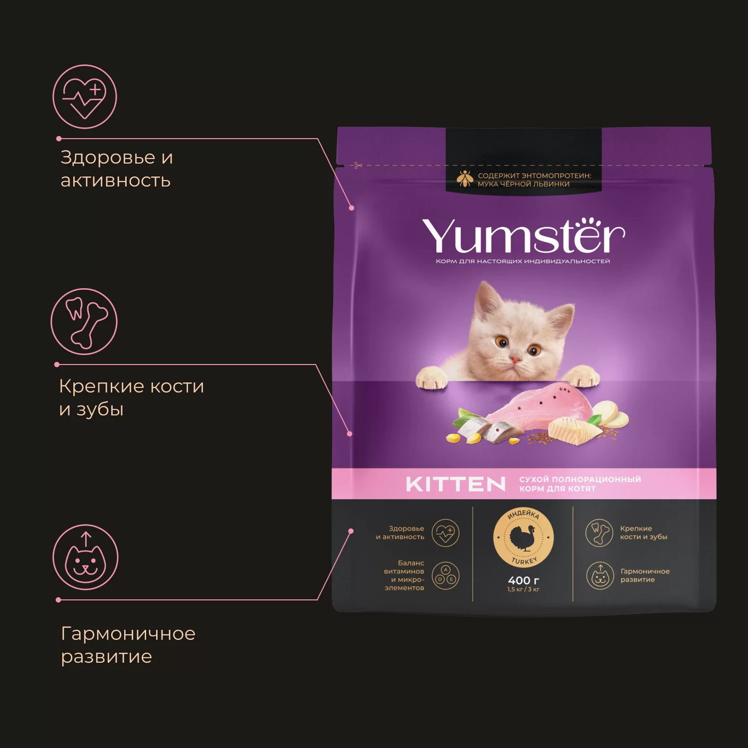 Корм Yumster для котят с рыбой содержит полный набор веществ, необходимых растущему малышу с учетом природных потребностей пушистого хищника. Прежде всего, это вкусное сочетание мясных и рыбных ингредиентов, а также полезные злаки и другие натуральные компоненты для здорового пищеварения. Сбалансированный витаминно-минеральный комплекс обеспечивает здоровый рост, гармоничное развитие и отличное настроение котенка.