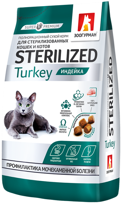 Состав: дегидрированное мясо индейки, пшеница, кукуруза, рис, животные жиры, растительная клетчатка, гидролизованные животные белки, пивные дрожжи, лососевый жир, витаминно-минеральный комплекс (витамины: А, D3, Е, В1, В2, В3, В4, В5, В6, В9 (фолиевая кислота), В12, Н (биотин) и микроэлементы: железо, медь, цинк, марганец, йод, селен, калий, магний, кобальт, натрий), пробиотики, Таурин, DL-метионин, L-цистеин, L-лизин, плоды шиповника, экстракт Юкка Шидигера, антиоксиданты.