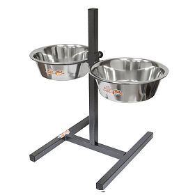 Подставка квадратная с двумя металлическими мисками из нержавеющей стали. Объём каждой миски 1,6 л. Подставка регулируется по росту питомца, высота варьируется от 10 до 30 см. Возможность регулирования высоты мисок содействует правильному развитию скелета и осанки питомца. Подставка очень устойчивая, а ножки на резинках препятствуют скольжению по поверхности пола. Покрытие мисок и самой подставки обладает стойкостью к внешнему воздействию и безвредно для здоровья любимца.