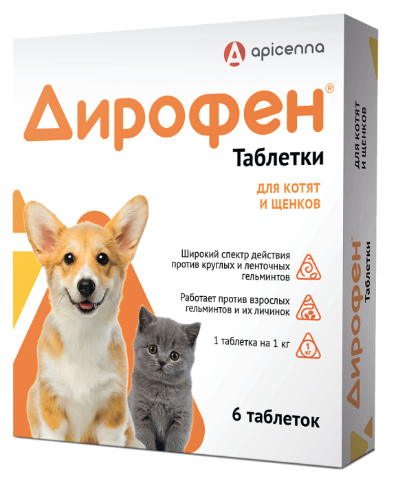 Дирофен таблетки для котят и щенков — 1 таблетка на 1 кг массы животного.