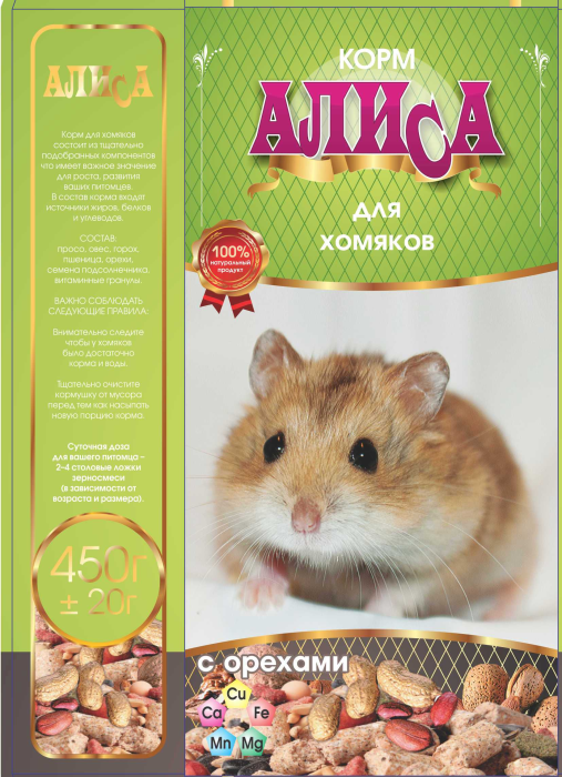 Корм для хомяков "Алиса" с орехами - это сбалансированный состав, который станет отличным выбором для вашего питомца. В составе корма только злаки и витамины, которые отвечают за здоровье вашего питомца. Корм "Алиса" идеально подходит для ежедневного кормления грызунов.